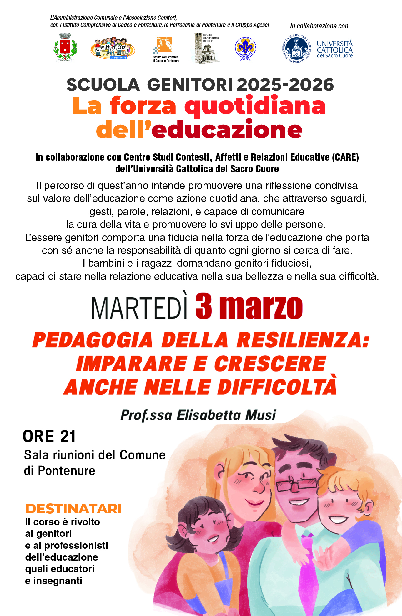 Martedì 3 Marzo 2026 - ore 21:00 - Sala riunioni del municipio - Incontro dal titolo: "Pedagogia della resilienza: imparare e crescere anche nelle difficoltà" con la Prof.ssa Alessandra Musi (Unicatt) - ingresso libero