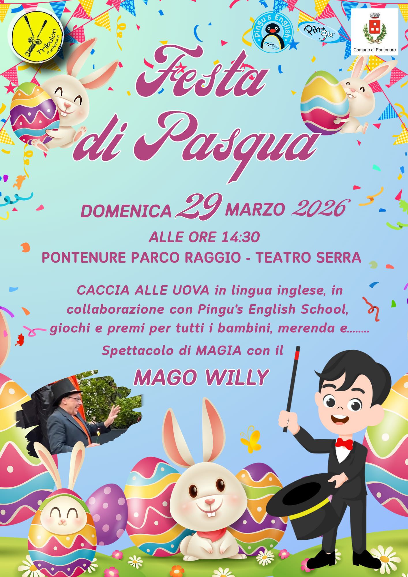 Domenica 29 Marzo 2026 - ore 14:30 - presso Parco Raggio e Teatro Serra - caccia alle uova in inglese, giochi di magia e merenda per tutti i bambini